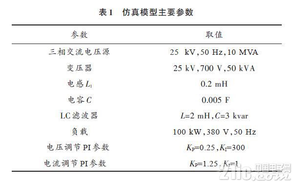 在控制工程实践中,PI控制器主要用来改善控制系统的稳态性能。PI参数的准确设置,对控制效果至关重要,可调积分时间常数TI 会影响系统达到稳定的时间和稳定性,可调比例系数kP 会对系统的响应时间产生影响。在本文设计的孤立逆变源中,利用工程整定的方法,对外环电压反馈值vabc 进行调节的PI调节器,其参数整定值为:kP =0.25,TI =300;对内环电流反馈Iabc1 进行调节的PI调节器,其参数整定值为:kP =1.25,TI =1。仿真结果