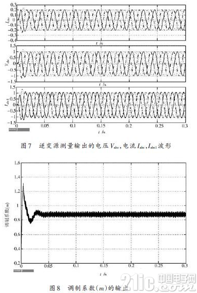 根据表1 的参数设置进行建模仿真,仿真开始后,逆变电源在很短暂的时间就达到了稳态运行,经测量模块2测量输出的电流Iabc 和电压Vabc ,测量模块1测量输出的电流Iabc1 ,以及调制系数m 的输出波形如图7、图8所示。