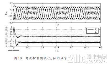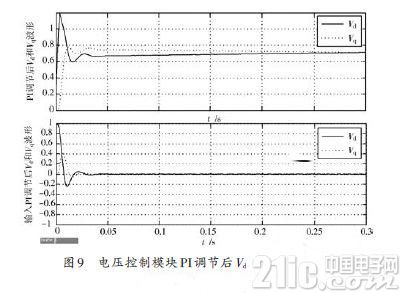 逆变电源运行达到稳态后,电压外环控制模块的PI调节的输入信号及经过PI调节后的输出信号如图9 所示。由图9 的输出波形可知,输入到PI的Vd,Vq 信号经过短暂的波动收敛到0,并输入到PI调节器中,经PI调节器调节后输出较为稳定的误差信号,作为电流内环控制的基准信号,保证了电流内环控制的稳定性。
