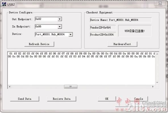 界面中的CheckoutEquipment分类框中为USB描述相关信息,由主机通过标准请求获得。上位机向FPGA发送命令后,通过接收按键,上位机可以接收到FPGA内部的数据,并在编辑框中显示出来。