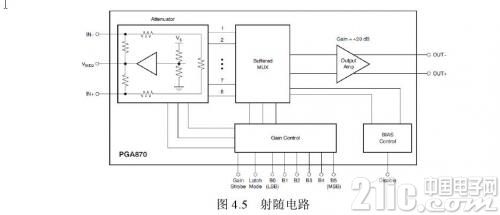 PGA870是一款高速全差分可编程增益放大器。它的高带宽、低失真、低噪音特性使它非常适合与14位ADC配合使用,其增益调节范围为-11.5 dB到20dB,增益步幅为0.5dB,增益准确度为0.03dB.频带范围为650MHZ.其内部结构图如图4.5所示。