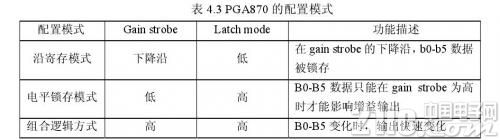 为实现信号增益可控,设计中选择PGA870芯片,因为PGA870有三种配置模式,分别是电平锁存模式,沿寄存模式,组合逻辑方式,由配置管脚gain strobe和latch mode控制,其配置方式如表4.3所示。