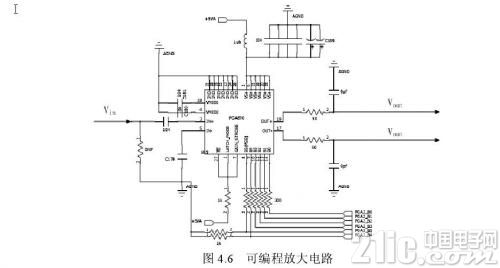 图中芯片仍为PGA870可变增益放大器,其输出方式为全差分的,能有效的抑制环境中的共模干扰,其CMRR可达到76db,PGA870的输出端采用RC网络进行信号的端接,能有效的减小信号的反射,并采用