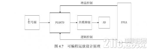 模块高速数据采集的前端信号,是频率和电压不确定的模拟信号。因为固定增益将使得大信号进入非线性工作区且可能导致放大信号超出数据采集的量程范围而出现信号被削平的现象,或者使得小信号放大不足,不能使放大信号达到或接近数据采集的量程范围而产生较大的量化误差。同时在仪器仪表中所要测量的信号其动态范围往往很宽,如在测量峰形信号的系统中,可能既有峰值很小的峰信号,又有峰值很大的峰信号。若放大通道不能随输入信号动态范围变化,而做出相应的增益调整,将会降低整个系统的分辨率及性能。由上述可知,放大通道必须增益程控可调,不能够采用固定增益的放大电路。