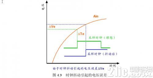 时钟对于高速ADC系统而言尤其关键,这是因为时钟信号的时序准确性可以直接影响ADC的动态特性。理想的时钟源是不会抖动的,因此ADC可以精确的在每个固定的时间间隔进行采集,但是实际电路中各种不确定的因素都会造成时钟的抖动。如图4.9所示,这种时序的不确定性带来的结果是采样波形出现一个为eΔV的误差电压,这相当于在原信号上引入了新的噪声,从而ADC的信噪比会受到数据转换过程的影响。