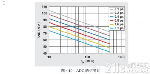 这种噪声反映在ADC的信噪比上就形成了如图4.10所示曲线,随着采样频率的提高,时钟抖动对于系统信噪比的影响越来越大,而同一频率时,高的时钟抖动也比低的时钟抖动给系统带来更多的误差。