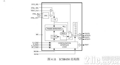比较上述三种方案,本系统采用方案3.由于AD9216的时钟输入为80M的单端COMS电平时钟,且一共需要三个这样的时钟,考虑到前面高速DA需要一个500M的LVPECL电平时钟,故系统时钟采用AD公司的ICS8430,该芯片结构如图4.11所示: