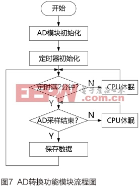 为了进一步减少系统的功耗,同时考虑到光线照度的变化较为缓慢,因此每隔2分钟对光照强度进行一次采集,期间CPU被设置为休眠模式;即便是在AD进行采样和转换过程中,也可将CPU设置为休眠模式,进一步减少能耗,只在AD完成数据转换后启动CPU进行数据的保存和下一步的操作。