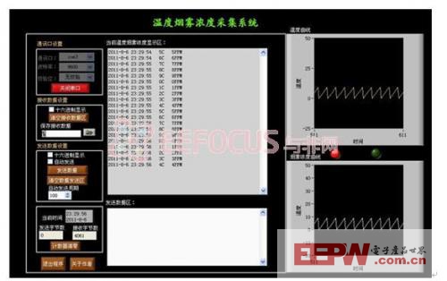 单片机将接收到的烟雾浓度和温度的值通过串口通讯发送到上位机软件上,在“当前温度烟雾浓度显示区”显示每一时刻的值,并将一分钟之内采集的参数值汇成一条曲线,这样便于工作人员分析当前环境中参数的变化规律,而且在上位机软件上我们也加入了报警功能,当参数值超过正常指标后上位机软件上的指示灯由绿色变为红色,及时提醒工作人员。此上位机软件还可以将各个时刻的信息全部保存下来,方便工作人员查询。