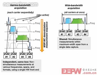 图 2. 该图比较了使用窄带宽硬件对每个载波进行连续采集(左侧)和使用宽带宽硬件对全部载波进行同时采集(右侧),以用于调制分析。