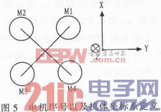 其中△φ=φ-φmid,△θ=θ-θmid,△ψ=ψ-ψmid。M1,M2,M3,M4分别表示电机1~电机4的控制信号,T表示油门通道控制信号,φ表示滚转通道控制信号,θ表示俯仰通道控制信号,ψ表示偏航通道控制信号,φmid、θmid、ψmid分别表示滚转、俯仰、偏航通道控制信号的中立值。