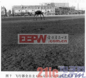 依据上述的各个部分完成了飞行器硬件平台的搭建和控制算法程序的编写和调试,并反复进行了试飞调参,最终达到了比较理想的效果,实现了飞行器的全自主GPS定点定高定航向悬停,并且在外界强干扰的情况下能够很好地稳定姿态。飞行器全自主GPS定点定高定航向悬停飞行如图7所示。