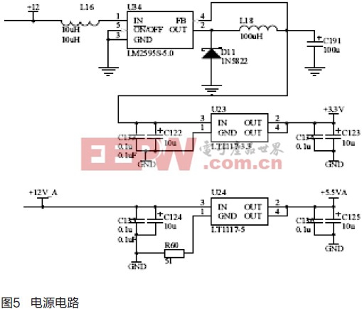 低压电源选择上海衡孚开关电源厂的HF35W-D型开关电源,输出电压为+12V/2A和-12V/1A。电路中共用到的电压有+12V、+5.5V、+3.3V和-12V。其中+12V和-12V经滤波后用于高压及模拟电路供电;+12V通过开关电源LM2595降压至+5V,再经LDO芯片LM1117-3.3转换成转换成3.3V,用于数字电路供电,这种开关电源+LDO的组合电源模式兼顾了高效率和低纹波等特点;+12V通过LDO芯片LM1117-5转换成转换成+5.5V,用于DA数模转换电路供电。具体电路如图5所示。