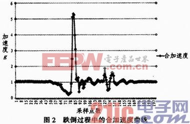 但是此幅值来判断的跌倒检测算法人体已经着地,跌倒伤害已经产生了,而本系统需要对人体进行保护,即必须在人体跌倒着地之前进行检测,因此不符合本系统的设计要求。经过多次试验找到符合本系统要求的过程(图2中从第50到第75个采样点左右),该过程一直呈下降趋势直到合加速约为零,且该过程也明显区别于日常动作。本系统中把合加速度的阈值设为0.88 g,当合加速度小于0.88 g时,系统进入预警状态,初步判定有可能发生跌倒,但是也有可能是突然站起或转身等正常动作引起的。由于该过程一直呈下降趋势,因此设计中将本次加速度的值与上一次的加速度值做差如果差值小于零计数,当计数值达到一定值的时候就可以判断人体发生跌倒。