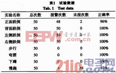 第二部分通过正常的日常活动来检测本系统的误报率,实验的日常活动包括步行、弯腰、下蹲和慢跑等日常行为,同样每类实验也进行50次。测试结果如表1所示。