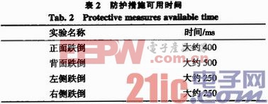 为了提高系统的可靠性,本次还研究了从防跌倒装置开始报警到老年人完全跌倒在地上之间的时间,我们根据采集到的数据和算法,得到装置开始报警到老年人完全跌倒在地上之间采样点个数,再根据采样时间求得时间。此时间越长表示后续的防护措施可进行更复杂的保护,老年人跌倒受伤的几率就越低。防护措施可用时间如表2所示。