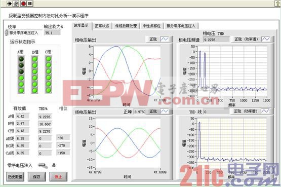 上述演示程序中,可以选择三种不同的故障处理方法,其原理在相应的选项卡标签中有简要介绍。左侧的指示灯用来表示六单元级联系统各个单元的运行状态,不亮的指示灯表示单元对应发生故障并被屏蔽。图5中表示的是A相三个单元故障时的工作情况,指示灯上面有系统此时的输出能力,可以看出,在A相三个单元故障的情况下,通过部分零序电压注入的优化调节方式,系统仍能够有接近75%的输出能力,比传统故障处理方式的输出能力(此时为50%)有很大的提高。指示灯下方的区域为相电压、线电压有效值归一化后的输出,各相电压的总谐波失真以及三相线电压的相位。右侧的选项卡标签里给出的是三相相电压、线电压的输出波形及其中一相的谐波分析。此外,程序还提供了零序电压注入的方式,用来提高直流侧电压的利用率,进而提高系统的输出能力。从运行结果可以看出,采用该种故障处理方式后,仅屏蔽故障的功率单元,因此三相相电压不再对称,幅值及相位均根据故障类型做出了相应的调整,而得到的线电压仍为幅值相等、三相平衡的输出,且不含有三次谐波分量。