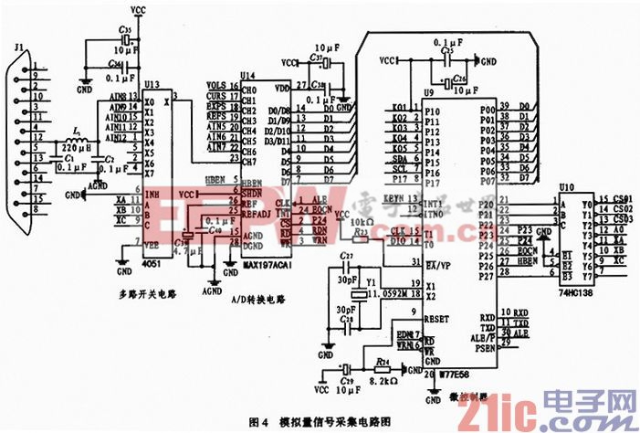图4是采集系统的一路模拟信号经过滤波电路、多路选择开关和A/D转换后进入微控制器的电路图。单片机W77E58的P0口与MAX197的D0~D7相连,既用于输入MAX197的初始化控制字,也用于读取转换结果数据。用W77E58单片机的P2.4作为MAX197的片选。选择MAX197为软件设置低功耗工作方式,所以置SHDN脚为高电平。采用内部基准电压,所以REFADJ和REF均接低电平。W77E58单片机的P2.6脚用做判读高、低位数据的选择线。直接与HBEN脚相连。MAX197的