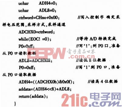 A2,A1,A0通过不同0,1组合选择8路模拟量中的某一路;RNG和BIP的0,1组合确定所采集模拟量的范围,最大为±15 V;ACQMOD决定MAX197采用内部采集模式还是外部采集模式;PD0和PD1组合决定选择正常工作模式还是低功耗工作模式。具体程序如下:
