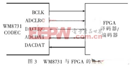 各芯片之间的互联通过引线连接到FPGA的IO脚。Nios II处理器的内部总线通过定义引脚连到IO,这样需要连接到Avavon总线的芯片可通过IO脚连到总线上。图3所示为WM8731CODEC芯片与主芯片FPGA的连接。