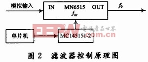 模拟器件的发展与集成为小型化提供了充分的条件,像松下公司的MN6515,仅为8脚,其带通滤波器的中心频率f0可由外加的时钟频率fcp控制,其比值fcp/f0约为15.7。只要改变fcp的值,带通滤波器的中心频率就会在O~32 kHz范围内移动,非常方便,可采用图2方式进行控制。