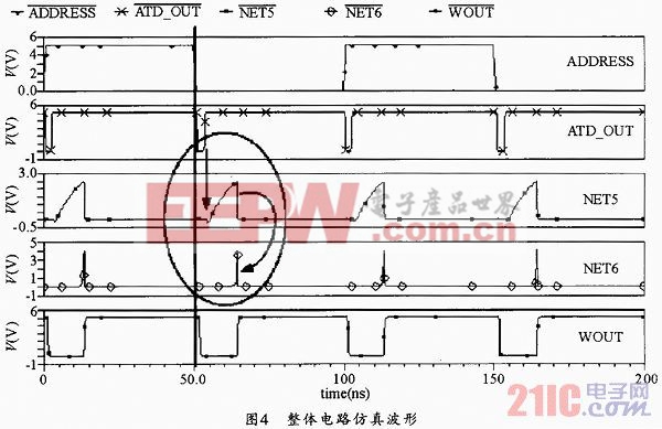 文中设计的电路的主要功能是产生一个时序信号源。类似于自定时方法。例如,将该信号作为控制信号的信号源,可以通过简单的延时、与、或等操作派生出相应的控制信号,这些信号就可用于控制存储器内部各功能模块如灵敏放大器以及锁存器等。该电路的特点是时序信号源的宽度可控,通过调整电容或者充电电流可以得到不同的输出脉冲的宽度,这可以结合存储器中所需要的控制信号的宽度来决定。