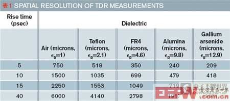 用一台性能良好的 TDR 可以获得相当好的空间分辨率(图 6 和图 7)。快于 10 ps 脉冲发生器与 50 GHz 或 100 GHz 带宽示波器的出现可以将 TDR 用于 IC 封装开发和故障分析。如果 TDR 可以分辨出毫米段上的阻抗,则可以看到接线的效果,以及金属化损伤是否会使一只 IC 性能失常。有了高速脉冲发生器和示波器,就可以实现微小的空间分辨率(表 1)。另外,有些高性能示波器带有进一步改进有效分辨率的软件技术,用于校准来自设备和连接待测设备与电路电缆的反射。