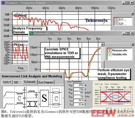 在Tektronix的 DSA8200 采样示波器中,软件 TDR 和 TDT 只是整个软件包的一部分,软件包用于分析通信参数。Tektronix公司亦提供iConnect软件,它运行在DSA8200主机上,或在一台PC上独立运行(图8)。它将TDR数据转换为S参数、分析抖动,并改善 DSA8200的原生 TDR 分辨率。该软件亦使用 TDR 数据来推导出被分析电路的 SPICE 模型,举例说,你可以对一根承载高速 LVDS 串行数据的带状电缆建立一个 SPICE 模型。然后将这个 SPICE 模型交给 IC 设计者,以显示负载的复杂阻抗,或者在系统级仿真时评估传输介质。