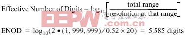 数字万用表(DMM)的参数指标又是不同的表示方法,业界通常使用位数来描述数字万用表的分辨率,因此客户也经常认为一个6½位数字万用表必定可以精确到6½位。然而情况却并非如此,这里的位数仅仅关系到仪器所显示的数字的位数,并不是输入信号的可分辨的最小变化。因此需要查验仪器的灵敏度和有效分辨率是否足够的高,以保证该仪器能够提供所需的测量分辨率。例如,一个6½位DMM能够表示1,999,999个计数的给定范围。但如果仪器测量的噪声的峰峰值为20个计数,这个时候可分辨的最小变化为0.52 x 20个计数(分辨率 = 高斯噪声的电压或计数×0.52)。因而,在实际存在噪声的情况下,该6½ 位DMM的真正有效位数(ENOD)为: