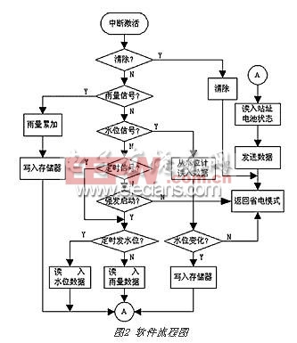 终端机的软件流程如图2所示。整个程序采用查询式结构,分为主程序和 中断程序。主程序包括端口、变量和内部寄存器的初始化以及数据处理。中断程序用于响应事件并对相应标志置位,然后将参数返回给主程序处理。将微控制器从低功耗模式唤醒至激活模式共有两类中断:外部中断和内部中断。由于雨量、水位、强发信号具有随机性,故由微控制器的外部中断响应这三个事件。另外由片内定时器产生内部定时中断,用于在无水位和雨量变化时定时发送数据。对于清除、站址等编程功能,则在主程序中通过对外部编程开关的读取来完成。