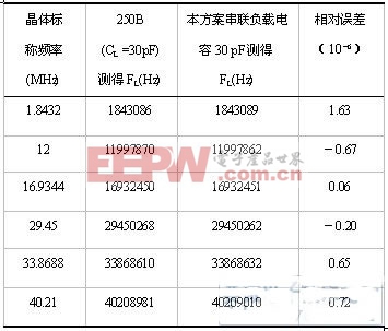 采用本方案,选取负载电容CL值为30pF,以标称频率为16.9344 MHz的晶体进行计算,得到夹具所造成的杂散电容CX值为2.89 pF,测得一组实验数据如下表:
