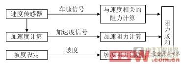 加载阻力计算模块的输入为滑行实验获得的模型系数、车速、滚筒半径、整车质量以及质量换算系数。此模块的功能是把速度信号按等距离离散化生成一系列数列,然后对生成的数列每相邻两点进行微分,近似求出该段中点处的导数,然后输出各点导数即为角加速度数列。得到加速度数值后,再按上文的加载阻力计算公式以图形化程序进行计算即可得到模拟的加载阻力作为此模块的输出。加载阻力计算原理图如图3所示。