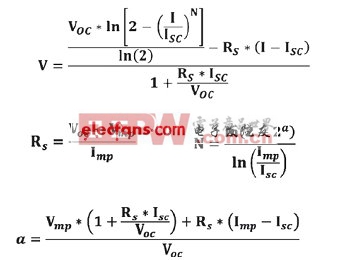 为了能够精确仿真太阳能电池板在特定环境条件下的输出(特别是对于小功率逆变器,仿真精度的要求往往更高),很多厂家推出了专用的太阳能方阵模拟器,用于模拟各种环境下太阳能电池板的输出特性,精确地复现出不同环境条件下的I-V输出特性曲线。I-V曲线的数据多来自于用户对太阳能电池板输出的实际测量结果。为了简化操作,目前国际上通用的曲线设置方式是:通过I-V曲线上的四个特征值,即Voc(开路电压值)、Isc(短路电流值)、Vmp(最大功率点电压值)、Imp(最大功率点电流值)来拟合得到完整的I-V曲线。所使用到的公式如下所示: