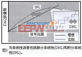 因多路传输DAQ设备上的仪器放大器必须能够在较高的增益和采样速率下从具有不同电压水平的多个通道获取精确的读数。由于这些要求,大部分市售仪器放大器均具有DAQ设备所需要的精度。如NI PCI-6052E经过4μS稳定在0.305mV的范围内,而采用线性技术LT1102高速、精确仪器放大器在同样长的时间内却稳定在2.5mV的范围内。即使在把一个精密仪器放大器与PCI-6052E上的所有元件包括仪器放大器在内的稳定时间进行比较时,DAQ设备也表现出87.7%的精度改善。 2.4“抖动”的硬件技术使偏大和偏小的系统噪声接近 噪声诸如热或电等因素的干扰都会引起测量值偏离实际的被测信号,其偏移值被称为噪声层。由于“即测即用”数据采集(Measurement Ready DAQ)设备具有高性能元部件,加上其设计上的正确屏蔽、接地因素的周密考虑,这一切优秀品质使得设备的噪声最小化。图2展示的是一般的DAQ设备与“即测即用”数据采集设备在读取7.5VDC高稳定信号时的差异。 噪声层越低越好,但这只适用由于噪声导致的误差在理想的数据上下等同的情况之下。当搜集到一些数据并想算出其平均值时,这些数据却普遍偏高,这时,得出的结果会怎样,自然是数据偏高”。“即测即用”数据采集设备采用一种叫做“抖动”的硬件技术,解决了此类问题。“抖动”使得对信号产生影响的噪声偏大和偏小的可能性接近。从统计数据来看,此技术增强了该检测设备的精确性:抖动技术的使用不需使用者做任何工作,也不需要任何专业知识。 2.5能最小化了非线性误差所带来的影响 “即测即用”数据采集设备采用最优的组件,这使得模数转换器(ADC)中最常出现的误差最少化了。ADC的最常见误差主要分两类:即线性和非线性误差。线性误差包括增益误差和偏移误差。这两种误差可相对方便的用一个简单的线性公式得以纠正。“即测即用”数据采集设备的自校准功能可以自动地校准线性误差。 然而,非线性误差由于其难以在软件中纠正,将此类误差量小化则在设备的设计中显得犹为重要。非线性误差包括微分非线性(DNL)和积分非线性(1NL)。如图3所示,微分非线性指的是DAQ设备在检测不同电压高低时的差异;积分非线性是微分非线性误差的总和。高质量的组件与优越的板卡设计相结合,最小化了非线性误差带来的影响。 除了熟知的增益和偏移等一阶误差之外,INLDNL等高阶线性误差也可对精度造成极大的影响,即使公认DAQ设备的精度由模拟/数字转换器的精度所决定,但根据将模拟教宇转换器集成到电路板设计中所采用方式的不同,还可能出现许多误差源。 2.6 ”即测即用”数据采集设备的校准 电子元件会随着时间和环境的变化发生漂移。随着时间的流逝和环境的改变,电子器件的性能会受到影响;例如,某DAQ系统在25%时读数为2 .00V,而一年之后,即使在同样温度下,读数就可能变为2.01V了。为补偿此类漂移,需要对DAQ设备进行定期的调整或校准,当对“即测即用”数据采集设备进行校准时,将测试结果与已知的标准值作比较。若测量结果不在规格之内,则该设备就必须进行一定的调整。校准有如下步骤: *检查DAQ设备的当前运作是否在规定的误差范围之内; *若超出允许的范围,必须做一定的调整;调整之后,再次检查DAQ设备的运作是否符合规定; *发布校准证书,说明该设备已经与可溯源标准比较,可在规定范围内操作。 “即测即用”数据采集设备具有高精度的板上电压源,使得间歇性的自校准成为可能。自校准过程只需要软件的一个命令即可,无须其他信号连接,也无须多余操作。所有的“即测即用”数据采集设备出厂时都附有可溯源校准证书。 在使时间漂移量降至最低的过程中,也需要使用同样精确的参考电压使您的DAQ设备随着环境温度变化保持稳定。当范围为±200mV时,PCI-6052E在一年的时间里漂移了88.8μV,而Analog Devices公司的AD291精确电压参考在同样的时间内漂移达740μV。即使当将一个精密电压参考与一个发生时间漂移的PCI-6052E上的所有部件相比较时,设备也表现出88%的精度改善。 3、关于信号调理精度特征 3.1何谓信号调理? 信号调理是完整的数据采集系统的关键组成部分。它能通过放大、隔离、滤波或多路复用来提高系统性能和可靠性。对于某些传感器,如RTD,必须要有作为激励源的信号调理。 信号调理是数据采集系统中最重要也是最易被忽视的一部分。许多传感器都要求使用专门信号调理技术,而没有哪种DAQ设备能为所有的传感器提
