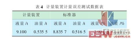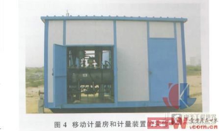 在质量流量计测量范围内,保证了计量准确度。 油室的设计[7]及其液位的测量与控制,提高了低产液油井原油产量测量的准确度。 3 分离器内液位、压力的控制 为了实现容器内的流态更加稳定,以及气体与液体、油水更加充分分离,装置采集了气液界面、油水界面以及容器压力等参数,通过先进的控制模型,并结合 16 位微芯片处理器,自动计算出油路、水路的流型控制方案,由油路、水路的电执行机构执行,使分离器内油水分离室的油水界面基本稳定在某一位置,使分离器内油室的气液界面能够在某一高度范围内变化,使分离器内气体压力能够稳定在某一设定压力值。 4 车载小型化设计 为了监测油井产量, 需要方便快捷地将油井原油产量计量装置运送到井口或计量站, 由此考虑将计量装置设计安装在小型移动式计量房内, 方便随时撬装。 用软管将计量装置与井口或计量站管线连接,实现油井液量、气量、原油含水率、原油产量等参数的测试。 小型移动式计量房和计量装置的实物图见图 4。 为了满足车载以及安装计量装置的要求, 房子总长为 4 800mm,高度为 3 000mm,宽度为 1 950mm。 现场实验 2008 年 9 月 16 日, 移动式油井原油产量计量装置吊装到现河采油二矿采油六队的河 68-4 计量站,经过一段时间的安装、调试,装置运行正常后,于2008 年 10 月 8 日~11 月 18 日, 进行了为期 42 天的试运行,并于 2008 年 11 月 23 日对装置的应用效果进行了现场测试。 1 现场测试思路 计量装置测量的油井产量与标准器数据对比,得出计量装置的计量误差,同时对油路、水路取样化验,验证计量装置的分离效果。 测试的基本原理采用静态容积法比对的方法,分离后油路含水原油进入 1m3的二等标准金属量器, 水路含油污水进入经过检定的 10m3的金属罐,测试过程中分别在油路和水路取样, 送至油田质检所化验,得到油路含水率和水路含油率。油量标准值为 1m3金属量器中的原油量与 10m3的金属罐中的原油量的总和; 水量标准值为 1m3金属量器中的水量与 10m3的金属罐中的水量的总和。 2 测试数据分析 通过现场严格测试, 此次测试的油量测量误差为 3.68%,液量测量误差为 3.04%。 具体测试数据见表 4。 由测试结果可知,移动式油井原油产量计量装置符合液量误差和油量误差小于 5%的设计要求,满足胜利油田单井计量的要求。 移动式油井原油产量计量装置较好地解决了传统计量装置不能连续、准确计量的问题,可以克服来液含水率高、气量少对测量仪器计量准确度的影响,保证了油井油气水产量计量的准确性。 下一步工作思路 移动式油井原油产量计量装置通过对油气水的高效分离以及先进的控制模型,实现了油井产量的连续准确计量,适用范围广,自动化程度高,较好地解决了油田油井产量准确计量的难题。 今后在油田的生产管理中将发挥巨大的作用。 下一步工作思路如下。 (1)对油田重点油井原油产量进行巡回监测 采用移动式油井原油产量计量装置对重点油井原油产量进行巡回监测,对于产量稳定的油井,适当延长测量周期。 对于产量波动大,或有异常情况的油井,增加测量次数,密切监控油井产量和其他生产参数。 (2)对现有计量装置进行校验 通过现场测试油井产量, 对比现有计量装置的计量结果, 得出现有计量装置的计量误差和修正系数,以便对现有计量装置的计量结果进行修正。 (3)为油井施工效果评价提供依据 对油田维护作业井和措施作业井作业前后产量进行对比测试,结合示功图初步判断油井地下工况,为作业效果评价提供科学依据; 对油田采用新技术开发的油井进行产量测试, 科学评价新技术的实施效果。 [参考文献] [1] 高鹏.离心分离在油气工业的应用日渐广泛[J].中国海上油气(工程),1999,11. [2] 王跃进,袁惠新,赵晓梅.旋流分离技术在石油工业中的应用[J].石油矿场机械,2003,32(1):34~36. [3] 魏立新,刘 扬,张乐天.液-液水力旋流器的模拟分析与结构优化[J].石油机械,2006,34(1). [4] 李卫东,周芳德 ,李会雄 ,等.油水两相旋流分离试验[J].油气田地面工程,1997,16(6). [5] 赵庆国.液-液水力旋流器的研究与开发应用[J].化学工业与工程,2000,17(3):141~148. [6] 苏欣,范小霞,袁宗明,等.多相流量计研究与应用[J].石油工业技术监督,2005:34~37. [7] 张鸿初.油田原油脱水[M].北京:石油工业出版社,1990.