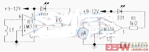 在电路正常情况下,即L1附近没有含铁物质存在,电感L1两端,即IC1的⑥、⑦两脚之间没有电位差存在,电路不工作,只要在L1附近有磁场变化(如有含铁物质存在),L1就会产生微小的交流信号,使比较器的两个比较端产生电位差,结果,在其输出端会有高低电平变化,LED即会闪烁(LED接通和断开),以指示L1附近有含铁物质存在。所以该磁场检测电路,可用于寻找地面上的含铁物。