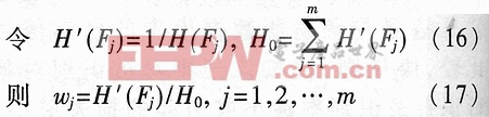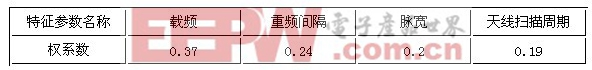 称为熵函数。 熵函数H(p)具有以下重要性质: (1)对称性:概率矢量p=(P1,P2,…,Pn)各分量p1,p2,,…,Pn的次序任意改变时,熵函数H(P)的值不变,即熵值只与集合X总体上的统计特征有关。 (2)非负性:熵函数是一个非负量,即: H(Pl,P2,…,Pn)≥0 (9) (3)确定性:集合X中只要有一个必然事件,其熵值必为零。 (4)极值性:集合X中各事件以等概率出现时,其熵值为最大,即有: H(p1,p2,…,pn)≤H(1/n,1/n,…,1/n)=1nn (10) 由熵函数的定义可知,熵值越小,不同类别的分离程度越大。从概率论的角度来看,某一特征的熵值越小则包含的确定性信息越多;反映在分类识别中就是它对识别结果的影响较大,这也意味着设置该特征参数所对应的权值要大一些,以保证识别的精度和准确性。 2.2 熵值分析法设置权重 对于有k类模式的雷达辐射源识别问题,已提取的特片参数共有m个,如式(2)所示。对每一个特征参数Fj;j=1,2,…,m,将其对应的分布区间分为相等的N段,记为rk(j),k=1,2,…,N.注意,这里的分布区间是指k类模式的最大可能的参数分布区间。满足Fj∈rk(j)的样本属于i类的概率为pki(j): pki(j)=[Nki(j)]/[Nk(j)] (11) 式(11)中,Nk(j)为有Fj∈rk(j)的样本数,Nki(j)为Nk(j)中属于第i类的样本数,于是有: 又设pk(j)为一个样本有Fj∈rk(j)的概率,则有: pk(j)=[Nk(j)]/N0 (13) 式(12)中N0为总的样本数,即: 从而定义特片Fj的熵值为: 根据熵函数的性质,熵值H(Fi)越小,各类模式在特征Fi上的类间分离性越大,则特征巧对分类的贡献越大,即在识别过程中的权重越大。如果有Fiεrk(j)的所有样本都属于同一类,则有H(Fi)=0。在这种情况下,用这一特征巧就可以实现分类识别。在得到各个特征参数的H(Fi)后,就可以定义相应的归一化权值如下: 需要注意的是,由于识别过程实际上是将侦察所得信号与辐射源数据库中的已知信号相比较,因而可以采用辐射源数据库中的数据作为熵值分析法的样本。这实际上是充分利用已有的知识数据库中的分类信息确定各特征参数在识别中的权值,以期得到较好的识别效果。 获得权系数后,就可根据相似性度量的大小判断一个特征向量应属于哪一类。若已知待识别信号为。,显然满足M'(s,ui)最小的类ωi与样本有着最大的相似度。即: M'(s,9ui)=min(M'(s,uj))→sεωi (18) 其中i,j=1,2,…,K,K为类的总数,ωi表示第i类。 3 仿真实验及结果分析 在该实验中以雷达知识数据库中11类雷达辐射源的识别问题作为研究对象。所采用的描述雷达类型的特征参数为:载频、重频间隔、脉宽和天线扫描周期。分段数N=100,经计算得到的各个参数在识别中的权重如表1所示。 表1 各参数在识别中的权重 下面考虑对某个已知类型的雷达的一批侦察数据进行处理,计算对该目标的识别率,得到的识别率与信噪比的关系曲线如图1所示。 由图1可以看出,为得到较高的识别率,要求信噪比达到5dB左右。进一步的研究表明该方法对未知的新类型雷达目标具有较好的判断能力;同时,分段数N的大小及由此决定的分段区间对权值的确定有一定的影响。当N足够大时,权系数的变化趋向稳定,最终得到的极限值就可以作为确定权系数的依据。 本方法在实际应用中还要注意特征参数的选取和识别权系数的确定,特别是对先验信息的利用,以期得到更佳的识别效果。