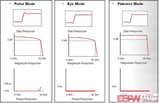 从上图可分析出Pulse Mode阶跃脉冲跃迁速率最慢,前冲为零,-3dB带宽内幅度有一定衰减,-3dB带宽外幅度滚降速率较慢,在高频点群延迟不为零;Eye Mode阶跃脉冲跃迁速率较快,前冲被显著提高,因为需要达到与过冲一致的对称性,在整个带宽范围内都保持群延迟为零,特别适合眼图等串行数据分析方法,同样在-3dB带宽内幅度有一定衰减,-3dB带宽外幅度滚降速率较慢;Flatness Mode阶跃脉冲跃迁速率最快,但也有最大的过冲和前冲以及振铃等,-3dB带宽内幅频响应较平坦,超过-3dB带宽后,频响曲线急剧下降,其在通频带内能保持线性相位响应,对于纯粹正弦信号和调制波形测试来说非常合适。
