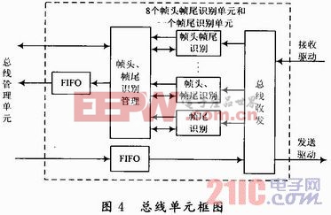 每个总线单元都采用如图4所示的结构,“总线收发”实现相应总线物理层收发。在总线单元中实现8个帧头识别单元和一个帧尾识别单元,实时匹配和提取协议。帧头识别单元记录有高优先级协议的帧头、帧尾、帧长等信息,DM642在识别出低优先级协议后,将该协议的帧尾、帧长等信息写入帧尾识别单元。无论是DM642还是任一帧头帧尾识别单元协议匹配成功后,帧头帧尾识别管理单元都将使其它帧头帧尾识别单元处于非工作状态,在该帧头帧尾识别单元根据帧尾或帧长提取完协议后,其它帧头帧