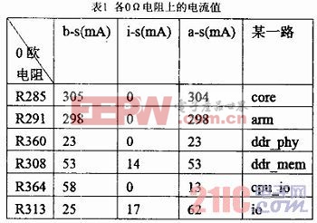 测试的0Ω电阻上的电流值如表1所示。b-s(mA)列代表系统休眠之前某电阻上的电流值;i-s(mA)列代表系统休眠之时某电阻上的电流值;a-s(mA)列代表系统完成唤醒时某电阻上的电流值;最后一列除了包含了上面提到了4路外,还包含DDR颗粒(ddr_mem)和外设(io)这两路。在休眠之前和完成唤醒后,系统都处于空闲模式。