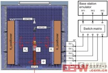 OTA测试(天线性能测试)是无线设备认证测试时的一个重要测试项目。而LTE采用的MIMO天线技术由于其复杂性而给OTA测试带来了极大的挑战。对此,RS公司推出了一个非常经济有效的创新方法:双通道测试法。采用了该测试方法的RS的TS8991测试系统如图2所示。OTA暗室内包含4个角度定位装置,两个测试天线和一个通信天线。此外,暗室墙角还有一个射频接入板可允许5路射频通道连接到暗室内的天线,外部设备包括无线综测仪(如RS CMW500)和开关矩阵(OSP)。整个系统由RS公司的 AMS32软件实现全自动测量,并出具测量报告。