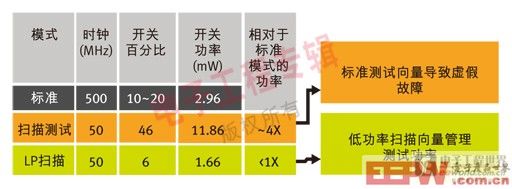 表1:使用测试波形电源管理技术的低功率扫描与传统扫描过程中开关功率的比较。