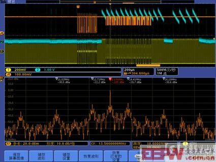 RFID读写器是一个包含了基带微控制器、RF发射和接收模块以及电源和控制总线的复杂的射频嵌入式系统。基带控制信号和系统内部寄存器的状态直接影响系统的工作状态。以我们测试的读写器为例,NXP CLRC632读写控制芯片包含了 压控振荡器、锁相电路、编码、解码、混频和发射/接收功能,芯片的工作受到单片机芯片STC 90c58RD+的控制。 MDO4000混合信号示波器独有的时间相关的跨越分析功能,为以RFID为代表的物联网设备的研制和调试提供了有力的工具。使用MDO4000不但能够轻松测量信号的模拟波形、频谱状况和各种频域参数,更可以通过AvsT、FvsT和ΦvsT这些调制域轨迹,简便地验证产品是否符合国际和行业标准的规定。更重要的是,由于将模拟信号、数字信号和总线信号,与射频信号在时间上关联起来,我们既可以通过这些信号时序关系,验证系统实际工作的过程,也可以通过对总线信号、寄存器数据的分析,查找除产生故障的原因。目前MDO4000是市场中唯一一种能够提供此类功能的测试仪器。我们希望MDO4000能够加速物联网产品的设计,为整个产业的发展贡献力量。