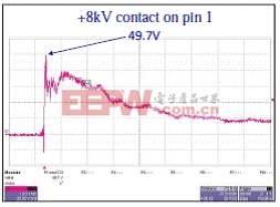 红色测量值表示外接齐纳二极管的LTTC共模滤波器。在施加一次8kV接触静电放电脉冲后,钳位电压上升到250V,几乎是内置TVS保护二极管的硅滤波器解决方案的5倍。