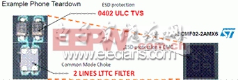基于LTTC滤波器的解决方案在印刷电路板上占用大约4.5mm2的空间,而ESD保护滤波二合一芯片CMF占板仅为2.8mm2,节省印刷电路板空间40%。考虑到元器件的间隙,意法半导体解决的优势就更加明显,节省空间超过50%。