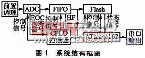 本课题研究的数据存储管理系统是分布式测试系统基站的重要组成部分。该模块实现了对冲击波数据、水声定位信号、环境温度等多种数据的存储管理,为事后数据分析处理提供可靠保证,并通过与基站中的无线收发模块通信,实现与主站的通信。图1为系统结构框图。数据存储管理系统主要由单片机与CPLD组成,本系统通过在CPLD内部扩展SPI接口电路,完成冲击波、水声定位等信号的存储;并在NAND Flash存储器中构建文件系统,实现对多种大量数据的存储管理。