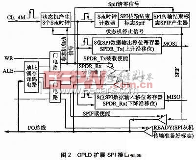 本数据存储管理系统以单片机和CPLD作为核心控制器。由于单片机的端口、内部串口等资源数目有限,需在CPLD内部扩展SPI接口电路,不仅简化了接口和控制,提高了系统的整体性能及工作灵活性,还使系统扩展变得可行。CPLD扩展SPI接口框图如图2所示。