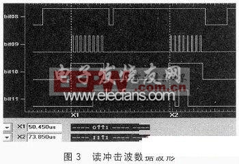 图3为CPLD扩展SPI接口电路读取冲击波模块数据时的波形。bit8为READY信号,从机高电平时主机读取数据;bit9为SCK时钟信号,主机查询READY为高时主机产生8个SCK时钟,启动SPI传输;bit10为MOSI,主机输出端口;bit11为MISO,主机输入端口,SCK上升沿读取数据。图3连续两个周期读取的数据为0x07(00000111)、0xb0(10110000),两周期时间间隔为20.400μs,传输速度可达4×105bps。3 数据存储管理