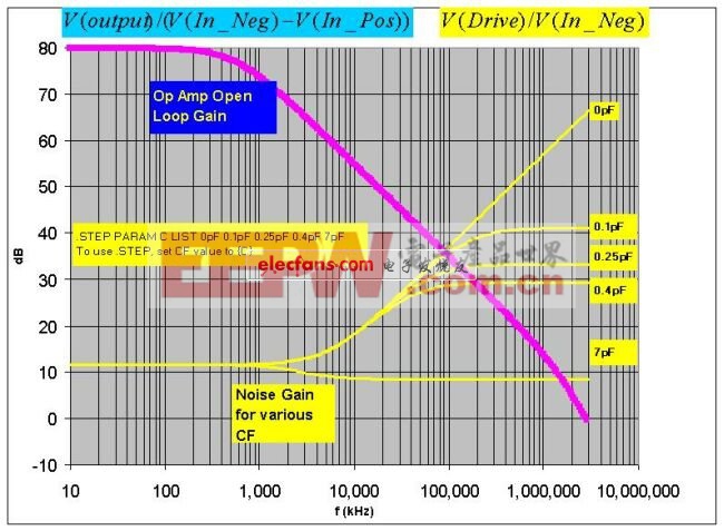 大部分Pspice仿真器都允许使用图6所示的“.STEP PARAM”语句来进行多级仿真并显示迭加的结果。其它仿真器可能有专用命令来实现此类同步仿真功能。最优CF值在噪声增益函数与LMH6629的开环增益曲线相交频率处给噪声增益函数设置了一个极点。由图6可知,在本例中,CF=0.25pF。