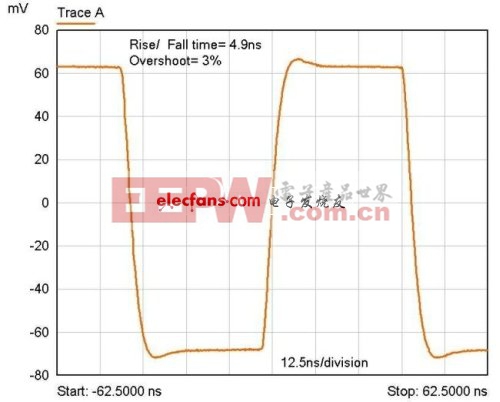 图10:CF_eq=0.2pF时测定的频率响应。图10和图11分别显示了使用50?源和输出端负载得到的频率响应和阶跃响应结果。如图所示,-3dB带宽时,频率接近70MHz,没有峰值。阶跃响应曲线在上升时间和下降时间与频率响应相匹配,图中显示了最小过冲值,没有振铃,从而可以确定电路已被正确地补偿。为了对仿真作进一步确认,实验台测试验证了在没有补偿电容时出现的大峰值以及10pF电容跨接RF时所产生的全振荡过程。